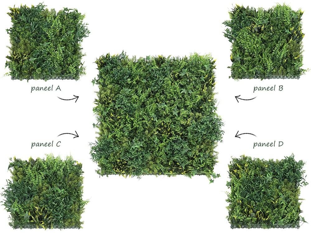 Bij standaard kunsthagen is elke mat identiek, waardoor bladeren en planten steeds op dezelfde plek terugkomen. Dit veroorzaakt een zichtbaar herhaalpatroon. Kunsthaagvoordeel doorbreekt dit met de ‘patroonloze’ / ‘geen patroon’ techniek: de beplanting is per mat net anders geplaatst, voor een natuurlijke look zonder herhaling. De 50×50 cm panelen komen in vier designs (A, B, C of D). We verpakken deze panelen willekeurig in bestellingen, dus een specifiek design kiezen is niet nodig.
