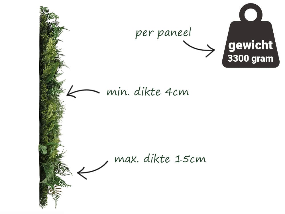 Bij de productie van de Baardmos Varens begroeiing is gekozen voor een high density beplanting. Dat betekent dat de wand 25 tot 35% meer bladeren en takjes bevat dan standaard uitvoeringen. Dit zorgt voor een bijzonder volle uitstraling en voorkomt doorkijk, zelfs bij sterke lichtinval. De hoge dichtheid draagt bij aan een luxe en natuurgetrouw resultaat, wat deze plantenwand ideaal maakt voor wie een realistische en hoogwaardige groene afwerking zoekt.