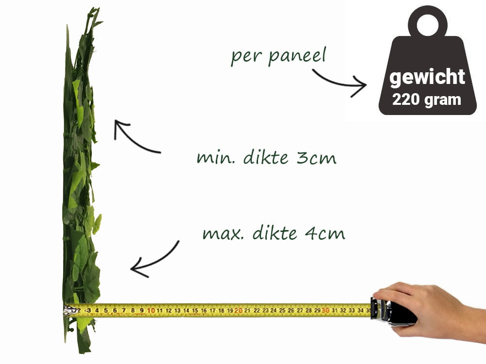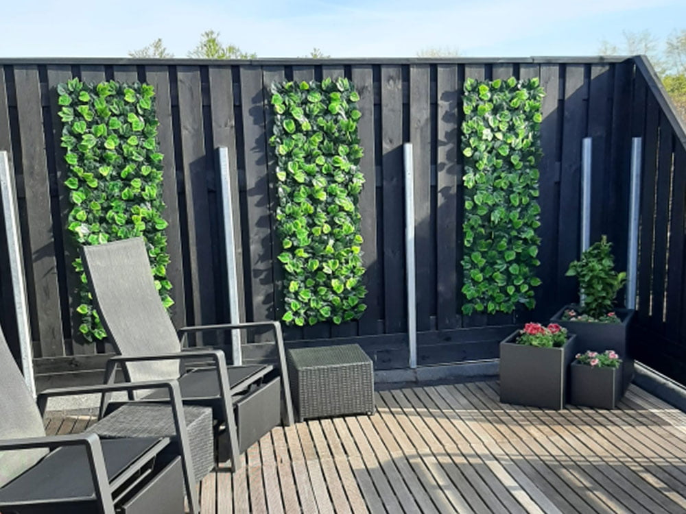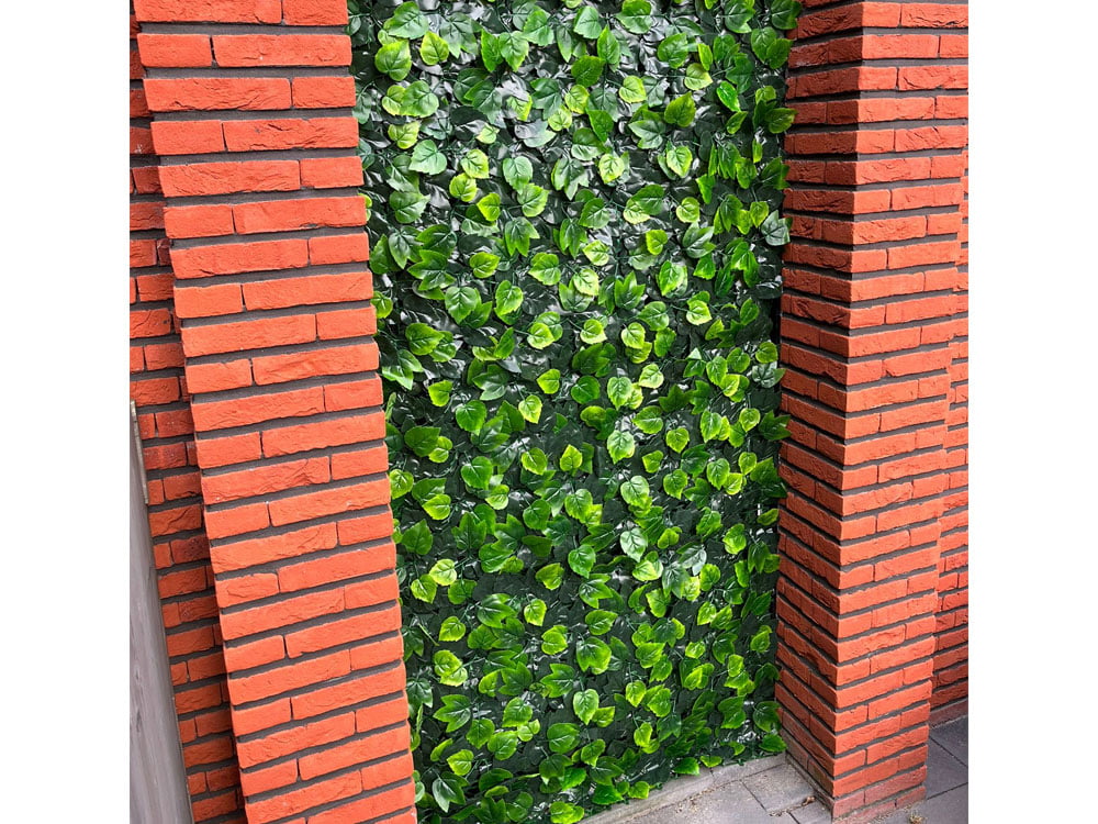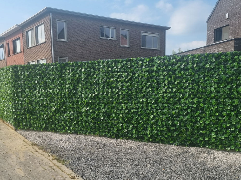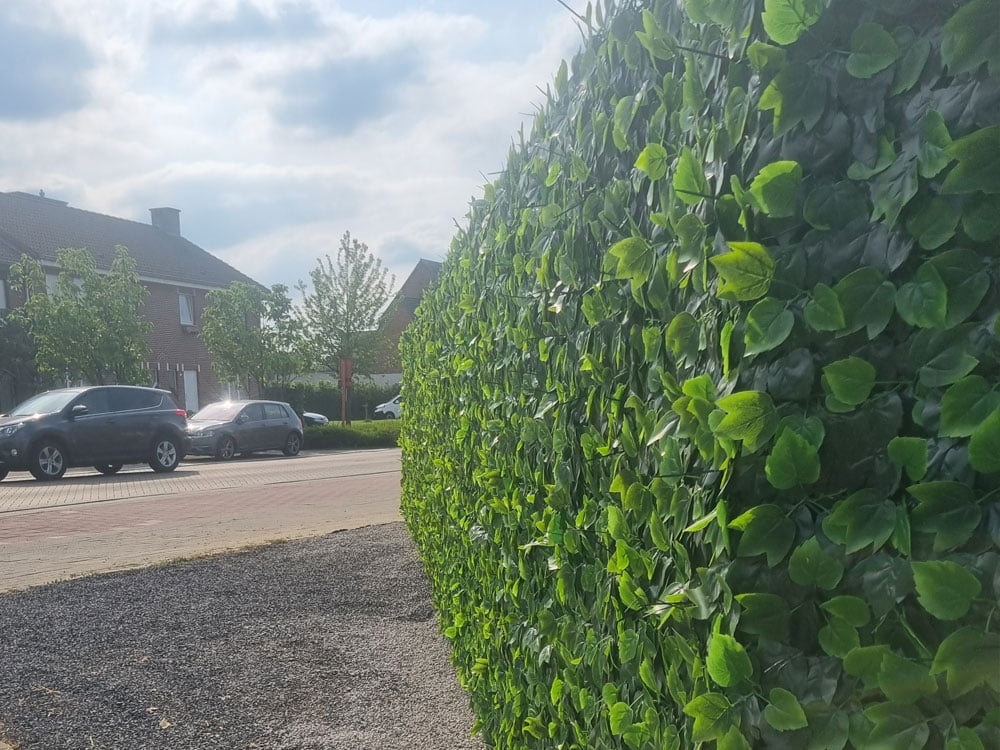 Hedera klimop kunsthaagmatten vloeien naadloos in elkaar over tot een weelderige groene oase met hun eenvoudige pin-en-gat constructie. Ze tooien elke muur en plafond met natuurlijke elegantie en buigen mee met elke ronding of schuin dak. Heldere montage-instructies zijn te vinden in de instructievideo naast de productafbeeldingen. Panelen bevestigt men moeiteloos met schroeven aan de schutting. In onze webshop zijn daarvoor schroeven en andere montage opties in bijpassende kleuren en maten te vinden. Deze zijn toe te voegen door ‘Ja, handig!’ te selecteren bij de montage materiaal optie bovenaan de pagina. Of bekijk onze < accessoires pagina hier >
