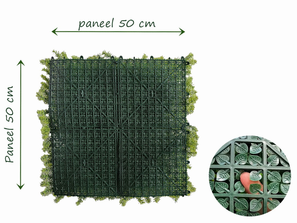 Nep moswand kunst klimop wordt vaak gebruikt voor schutting- en groene muurdecoratie. De kunststof moswand haag geeft elke saaie muur of schutting een natuurlijke touch met groene kunstbladeren, die levensechte details op de nerven hebben. De relatief grote bladeren creëren prachtige schaduweffecten in het zonlicht, wat de moswand een authentieke uitstraling geeft. Perfect ook voor het bedekken van inkijk bij hekwerken. Na installatie is geen onderhoud nodig. Montage gaat eenvoudig: de 50×50 cm matten klikken soepel in elkaar en zijn op maat te knippen met een huishoudschaar voor elke ruimte.