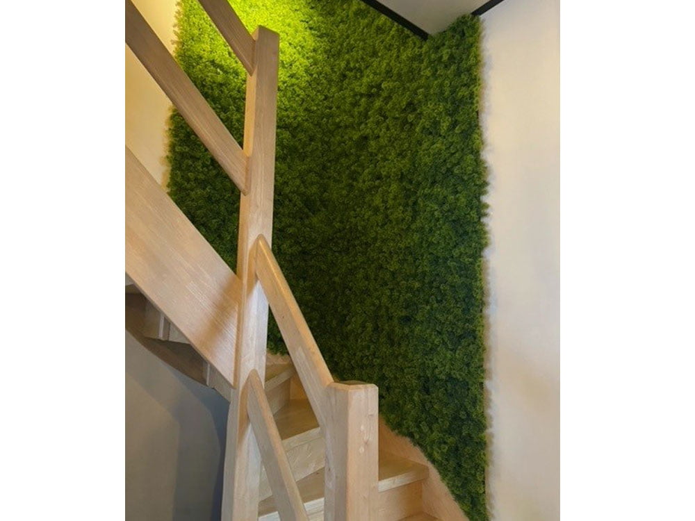 De Bos mos moswand is een kunsthaag die gekenmerkt wordt door zijn levendige en weelderige groene kleur. De haag bestaat uit een monotoon, maar textuurrijk bladwerk dat de moswand laat stralen. De bladeren zijn dicht op elkaar gepositioneerd om een hoge dichtheid te creëren, waardoor er een uniforme en volle groene uitstraling ontstaat zonder zichtbare doorkijk. Deze kunsthaag bootst de natuurlijke groeipatronen na met bladeren die in verschillende richtingen uitsteken, wat zorgt voor een dynamisch en natuurgetrouw effect. Ook het gebruik van variërende tinten groen versterkt de diepte en dimensie van de haag, en draagt bij aan de algehele levendige en frisse uitstraling.