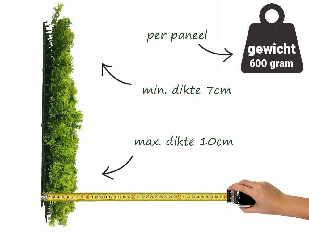 De doorkijk van de kunsthaag is volledig afgesloten dankzij de dicht op elkaar staande lichtgroene takjes. Tak lengtes variëren van 7 tot 10 cm, met een gemiddelde van 8 cm. Na montage zorgt voorzichtig “opfluffen” voor een realistisch ogende groene dekking. Hierbij creëert de variatie in lengte van de mos elementen een prachtig lichtspel door de subtiele schaduwen. Daarnaast is de kunsthaag Mos ideaal voor beurzen en evenementen, met zijn natuurlijke groene accenten. De combinatie subtiel groen mos met natuurlijke kleuren maakt dit model erg gewild. Stand bouwers passen de haag ook tegen plafonds en als vlakken vulling toe. De rijke groentinten bieden een betoverende look, die daarnaast verder naar smaak is aan te vullen met extra insteekbladeren.