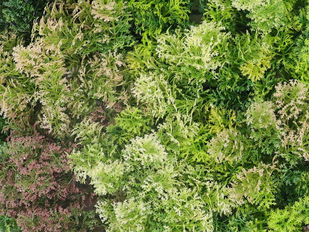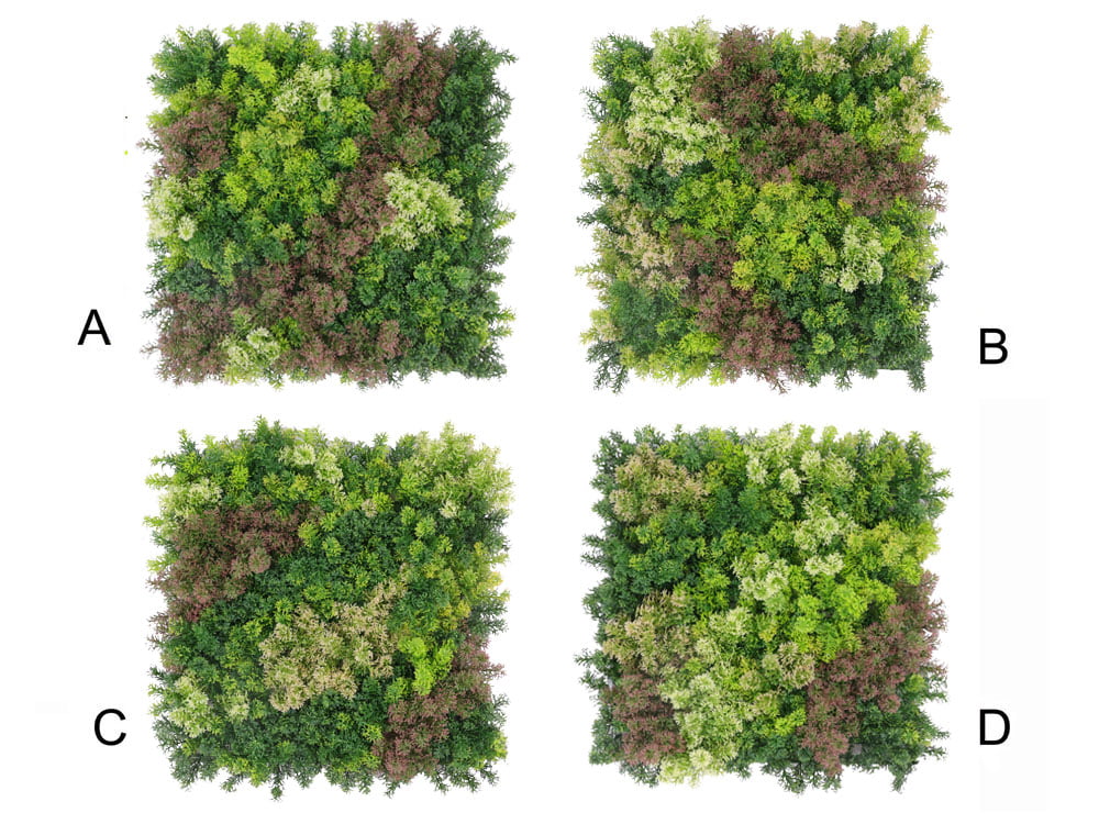 Deze kunsthaag biedt een volledig afgesloten doorkijk dankzij de dicht op elkaar staande lichtgroene takjes, variërend in lengte van 7 tot 10 cm, met een gemiddelde van 8 cm. Na montage zorgt een voorzichtig “opfluffen” voor een realistisch ogende groene bedekking. De variatie in lengte van de mos elementen creëert een prachtig lichtspel met subtiele schaduwen. Deze kunsthaag is ideaal voor beurzen en evenementen, dankzij de speelse variatie in kleuren. De combinatie van subtiel groen mos met natuurlijke bruine tinten maakt dit model bijzonder populair. Het mos kan zowel binnen op muren als buiten op hekwerken worden geplaatst. De rijke groentinten zorgen voor een betoverende uitstraling, die naar wens kan worden aangevuld met extra insteekbladeren.
