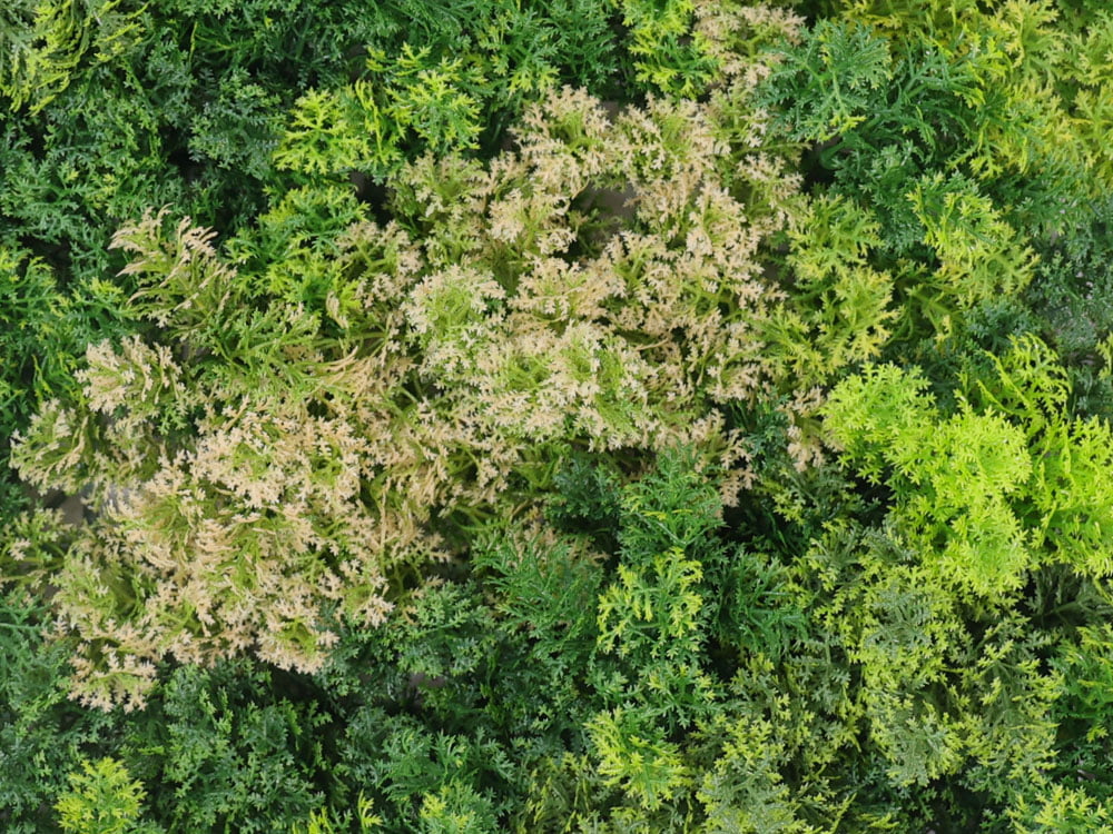Deze moswand combineert een rijke variatie aan kleuren en mostakken om een levendige en natuurlijke uitstraling te creëren. De mostakken variëren van diep donkergroen tot frisse lichtgroene tinten, met subtiele schakeringen van crème en beige die de textuur en diepte van de wand versterken. De verschillende groentinten en zachte overgangen tussen de kleuren zorgen voor een dynamisch en realistisch effect, waardoor de moswand eruitziet als een stukje ongerepte natuur. De fijn gevederde mosstructuren hebben een natuurlijke textuur, wat bijdraagt aan de levensechtheid van de wand. Deze mix van mostakken en kleuren zorgt voor prachtige schaduweffecten, vooral wanneer het licht op de wand valt, wat extra diepte en een gevoel van beweging geeft. Deze moswand is ideaal voor het creëren van een rustgevende, groene sfeer in zowel binnen- als buitenruimtes en biedt een onderhoudsvrije oplossing voor een weelderig, groen decor.