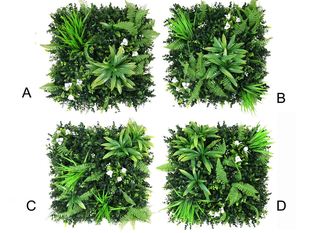 Goedkopere en standaard kunsthagen worden vaak identiek geproduceerd, waarbij elke 50×50 cm mat precies dezelfde bloemen en planten op dezelfde plek heeft. Dit resulteert in een herhaald patroon dat elke 50 of 100 cm terugkomt in de kunstplantenwand. Voor een natuurlijker en aantrekkelijker effect is het beter als de bloemen en planten op elke mat net iets anders zijn geplaatst. Wanneer meerdere matten aan elkaar worden bevestigd, ontstaat er zo een naadloos geheel zonder storende herhalingen. Bij Kunsthaagvoordeel noemen we dit de ‘zonder patroon’ techniek. Bij modellen waarbij herhaling mogelijk is, leveren we verschillende designs om dit te voorkomen. Door deze ontwerpen slim over de wand te verdelen, ontstaat een uniek en natuurlijk resultaat. De 50×50 cm panelen zijn beschikbaar in vier verschillende designs (A, B, C, D), die willekeurig in de doos worden verpakt, waardoor je altijd een gevarieerd eindresultaat krijgt zonder specifiek te hoeven kiezen.