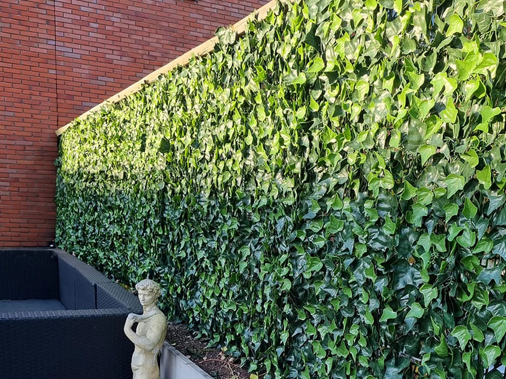 De populaire Hedera klimop kunsthaag, topkeuze in Nederland en België, is vervaardigd uit premium kunststoffen verrijkt met een exclusieve Nano-UV-blocker© voor langdurige kleurvastheid. Zelfs na acht jaar volle zon behoudt het zijn levendige groene kleur en blijft het flexibel voor een natuurlijke look.