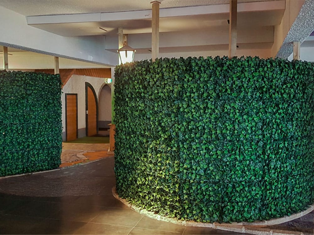 Kunstmatige hedera klimopmatten worden vaak gebruikt voor het decoreren van schuttingen en het creëren van groene muren. Ze brengen leven in een monotone muur of schutting met hun natuurlijk ogende groene bladeren. Zonlicht creëert door de grote bladeren een dynamische schaduwwerking, waardoor de wand een authentieke uitstraling krijgt. Deze klimopmatten zijn ook perfect om inkijk door hekwerk te beperken. Na installatie is er geen verder onderhoud nodig. Het monteren is simpel: klik de 50×50 cm matten aan elkaar voor een naadloos oppervlak dat naar wens op maat gemaakt kan worden.