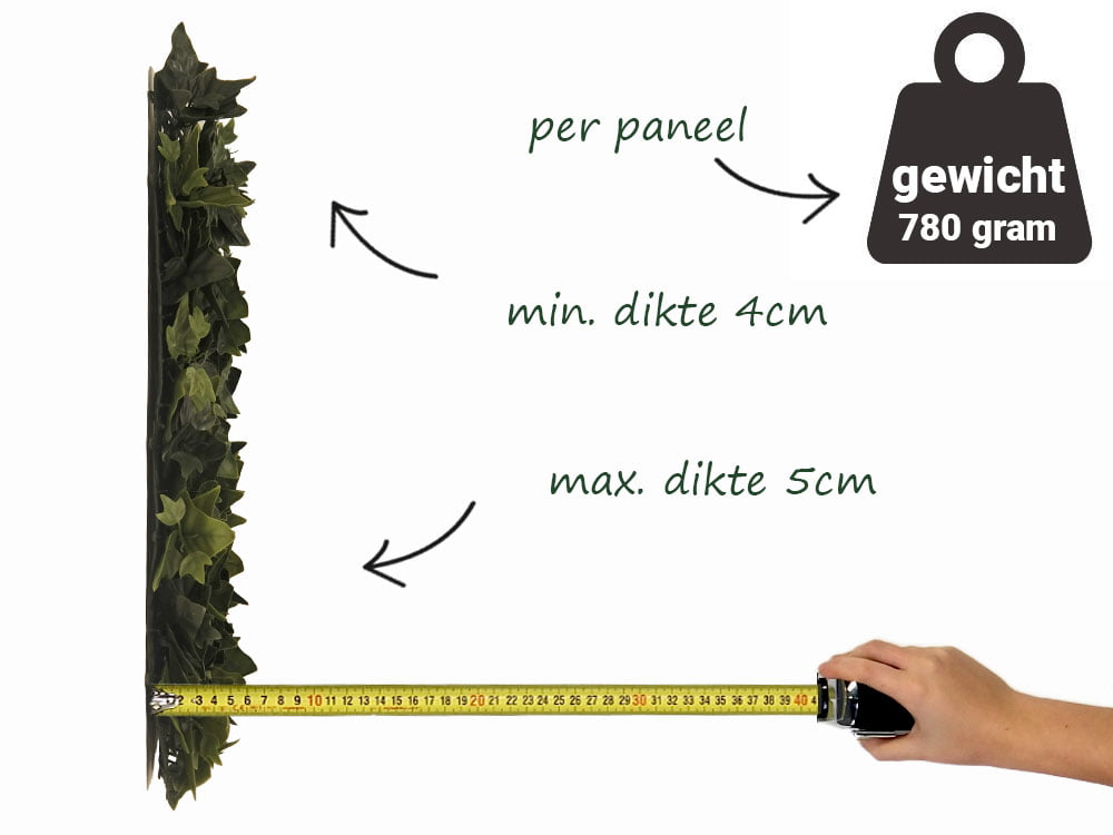 Hedera klimop matten zijn zonder gereedschap te koppelen en eenvoudig op elke gewenste oppervlakte te monteren voor een realistische kunsthaag op maat. Ze vormen een uitstekende basis voor een kunstplantenwand, geschikt voor zowel binnen als buiten. Het samenstellen van een kunsthedera schutting is zo gepiept: klik de panelen in het gewenste formaat aan elkaar en bevestig ze met schroeven. De reallook variant, met een volle bladbezetting en natuurgetrouwe kleuren, zorgt voor een natuurlijke uitstraling. Voor een uitgebreidere uitleg over de installatie van de hagen hebben wij een video toegevoegd tussen de product foto’s. In onze webshop zijn schroeven en andere montage opties in bijpassende kleuren en maten te vinden. Deze zijn toe te voegen door ‘Ja, handig!’ te selecteren bij de montage materiaal optie bovenaan de pagina. Of bekijk onze < accessoires pagina hier >