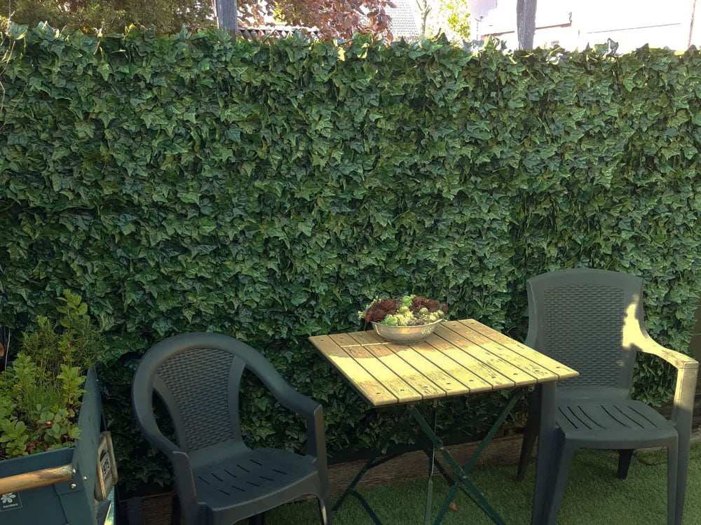 Nep hedera kunst klimop wordt veelal ingezet als decoratie voor schuttingen en groene wanden. Kunststof hedera hagen toveren elke saaie muur om in een natuurlijke groene omgeving. De grote bladeren creëren een betoverend schaduwspel in zonlicht, wat de wand een levensechte uitstraling geeft. Ook ideaal voor het bedekken van doorkijk bij hekwerken, zonder dat er onderhoud nodig is. Montage is simpel: de matten van 50×50 cm klikken eenvoudig aan elkaar en zijn op elk formaat te snijden met een huishoudschaar. Een hedera klimop van kunststof biedt praktische voordelen: snoeien is overbodig en overwoekering van de tuin behoort tot het verleden.