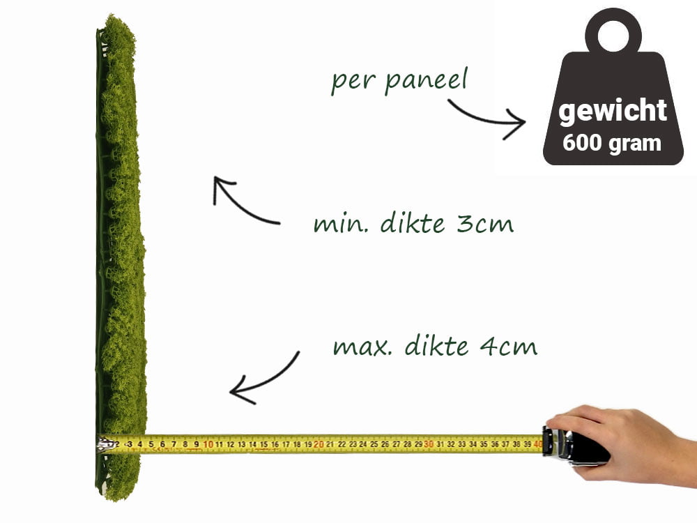 Moswand matten klikken moeiteloos in elkaar zonder gereedschap en bevestigen zich stabiel op elke oppervlakte, wat een op maat gemaakte, realistische moswand creëert. Deze muren vormen een solide basis voor een kunstplantenwand, geschikt voor binnen en buiten. Men kan de matten als sfeervolle muurdecoratie binnen gebruiken. Voor een moswandschutting, verbindt men de panelen en bevestigt deze met schroeven aan de schuttingplanken. Voor een uitgebreidere uitleg over de installatie van de hagen hebben wij een video toegevoegd tussen de product foto’s. In onze webshop zijn schroeven en andere montage opties in bijpassende kleuren en maten te vinden. Deze zijn toe te voegen door ‘Ja, handig!’ te selecteren bij de montage materiaal optie bovenaan de pagina. Of bekijk onze < accessoires pagina hier >