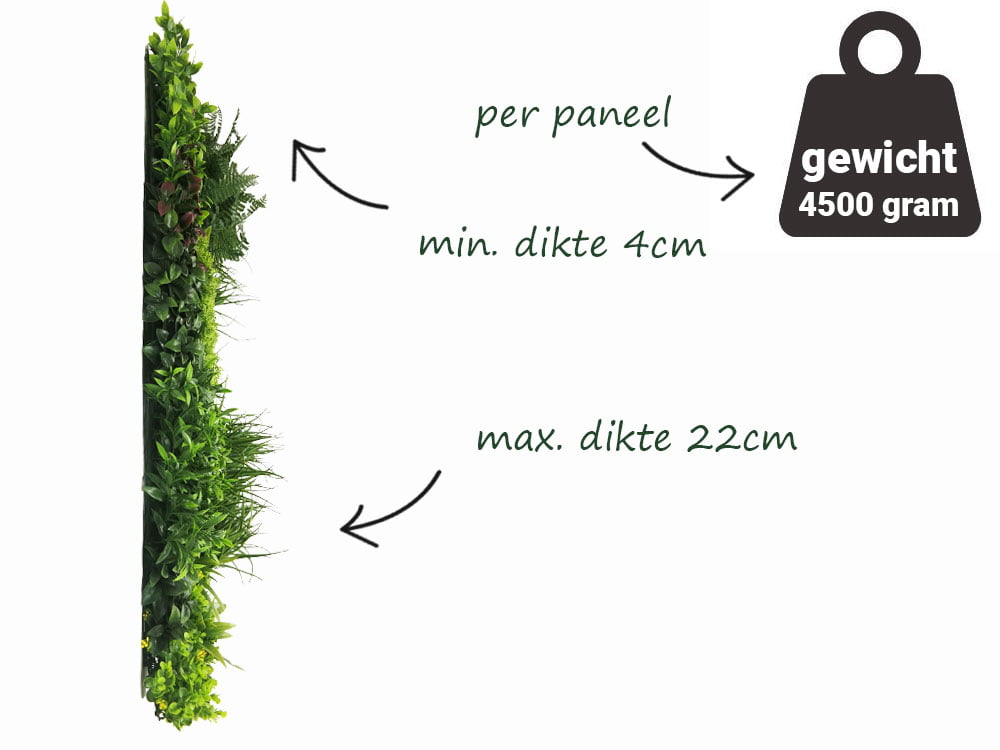 Onze Kunsthaag biedt met zijn dichte plaatsing van lichtgroene takjes privacy en een volle aanblik. De takken, variërend van 4 tot 22 cm, vormen een natuurlijk groen scherm na een simpele opschudding. Een rijke variatie aan bladvormen, waaronder wilde varen, mooie mossen en sierlijk gras, creëert een weelderige jungle-ambiance. Licht en schaduw spelen levendig door de lengteverschillen van de bladeren, wat een dynamisch effect geeft. Deze kunsthaag is ideaal voor beurzen en evenementen, waar zijn design en kleuraccenten in wit, geel en rood opvallen. Bloemen en knoppen voegen een extra charme toe, met de optie om naar wens insteekbladeren toe te voegen voor meer volume. Elk paneel, wegend 4.500 gram, staat voor een volle en kwalitatieve uitstraling. Voor meer variatie, bekijk onze insteekplanten.