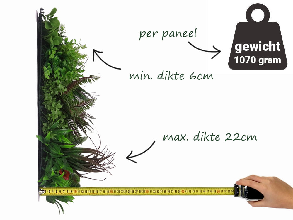 De doorkijk is 100% dicht vanwege de speciaal ingerichte dichte achterkant en de dichtheid van de lichtgroene bladeren. Taklengtes variëren van 4 tot 20 cm, met de langste behorend tot het gras dat verrijkt is met donkerrode accenten. Na montage zorgt een zachte ‘opschudding’ voor een natuurlijk ogende groene bedekking, terwijl de fijne bladslagschaduwen een prachtig lichtspel creëren. Deze kunsthaag is perfect voor beurzen en evenementen, met zijn variëteit aan planten die de aandacht trekken. De kunsthaag bevat roze orchideeën met realistische stampers, lang gras, gekartelde groen-rode bladeren en rode bloemknoppen, prachtig afgewerkt door subtiel lichtgroen mos. De Wild lime en varens met rode nerven voegen een verfrissende touch toe. Met zijn diversiteit en verfijnde structuur biedt de haag een sfeervolle look die nog verder gepersonaliseerd kan worden met extra insteekbladeren. Bekijk onze < insteekplanten hier >.