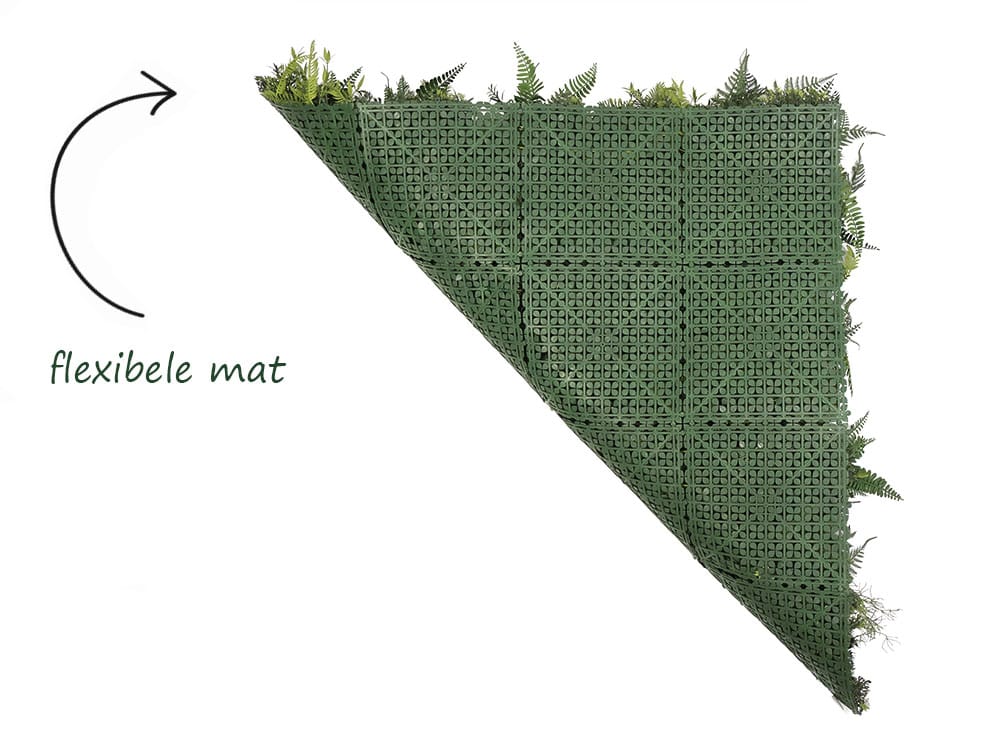 De Krulvaren Botanica plantenwand is opgebouwd uit een rijke variatie aan kunstplanten die samen een natuurlijk en gelaagd geheel vormen. De lange krulvarenbladeren vallen direct op en geven de wand diepte en een levendige beweging. Bovendien vullen compacte varens en mosachtige takjes de tussenruimtes en creëren ze een dichte ondergrond. Fijngeveerde bladeren met duidelijke nerven voegen luchtigheid toe, terwijl bredere tropische bladeren juist voor contrast en structuur zorgen. Ook zijn er donkergroene klimopachtige bladeren aanwezig die de basis versterken en de mat voller maken. Tussen het geheel steken speelse naald- en grasachtige plantjes uit, wat een wilde en jungle-achtige uitstraling geeft. Door deze combinatie van verschillende bladsoorten ontstaat een natuurlijk ogende plantenwand met veel variatie in textuur en kleur, waardoor de wand nauwelijks van echt groen te onderscheiden is en in elke ruimte een sfeervolle uitstraling geeft.