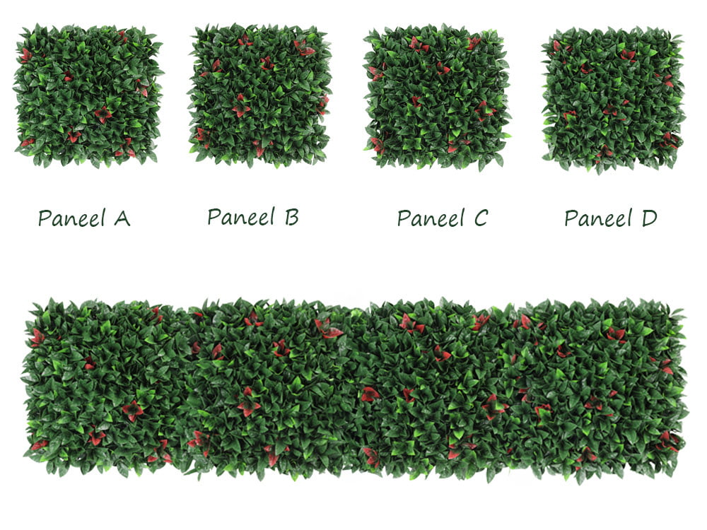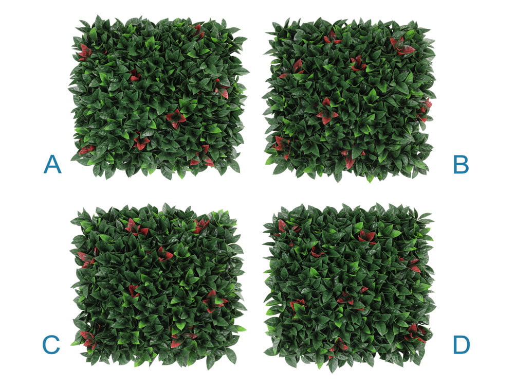 Zonder patroon – Dit model is uitgevoerd zonder vast patroon. De set bestaat uit vier verschillende panelen die onderling variëren in bladverdeling en structuur. Wanneer de panelen naast elkaar worden geplaatst ontstaat hierdoor een meer natuurlijke en gevarieerde groene wand.
