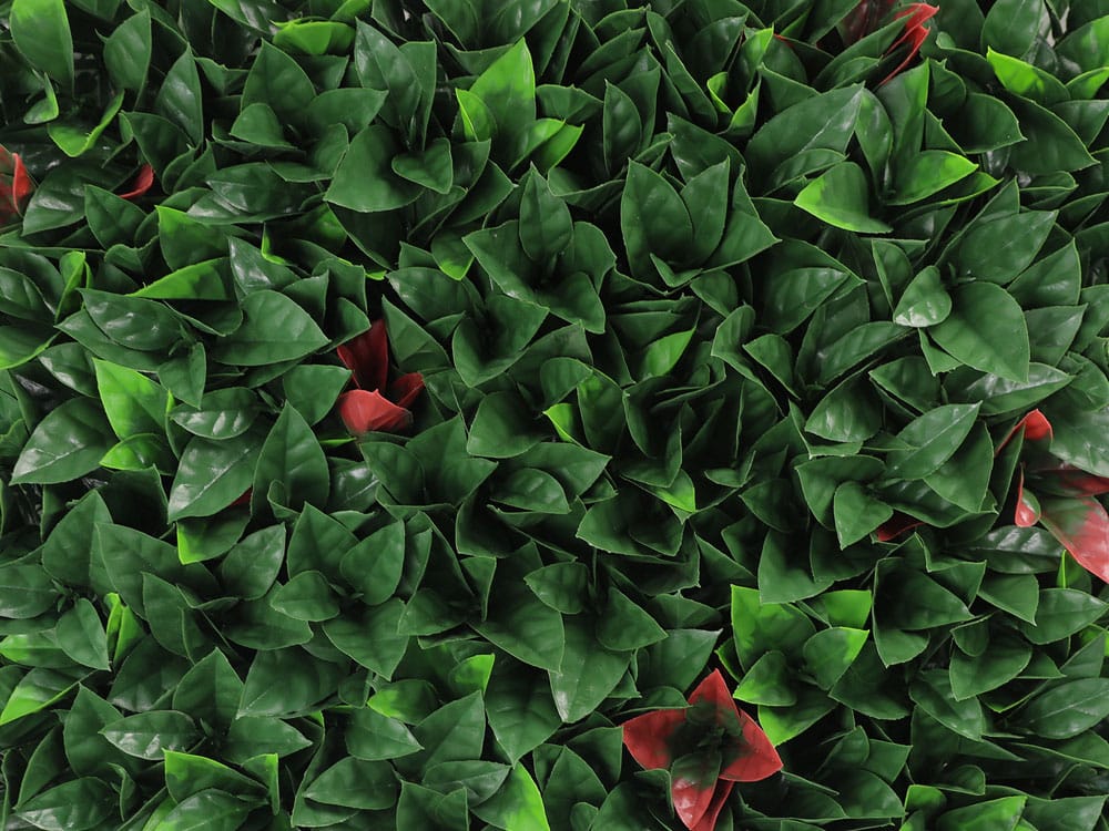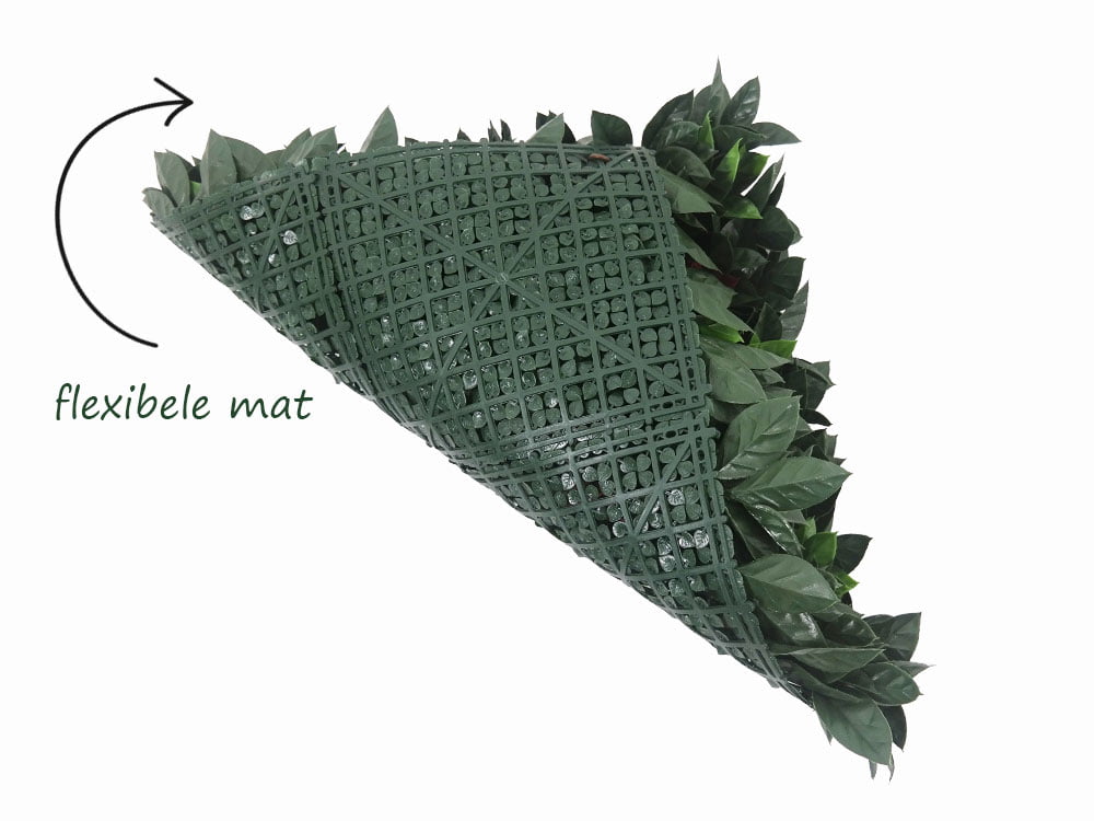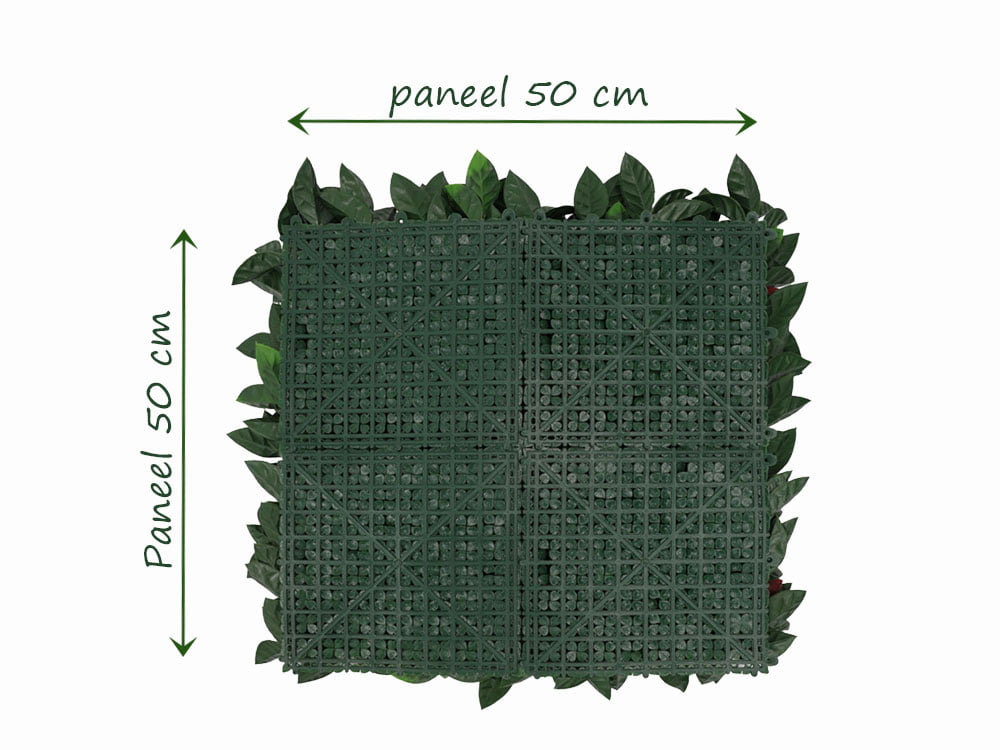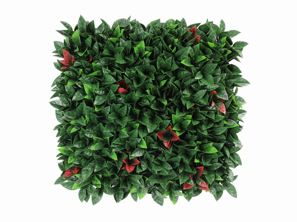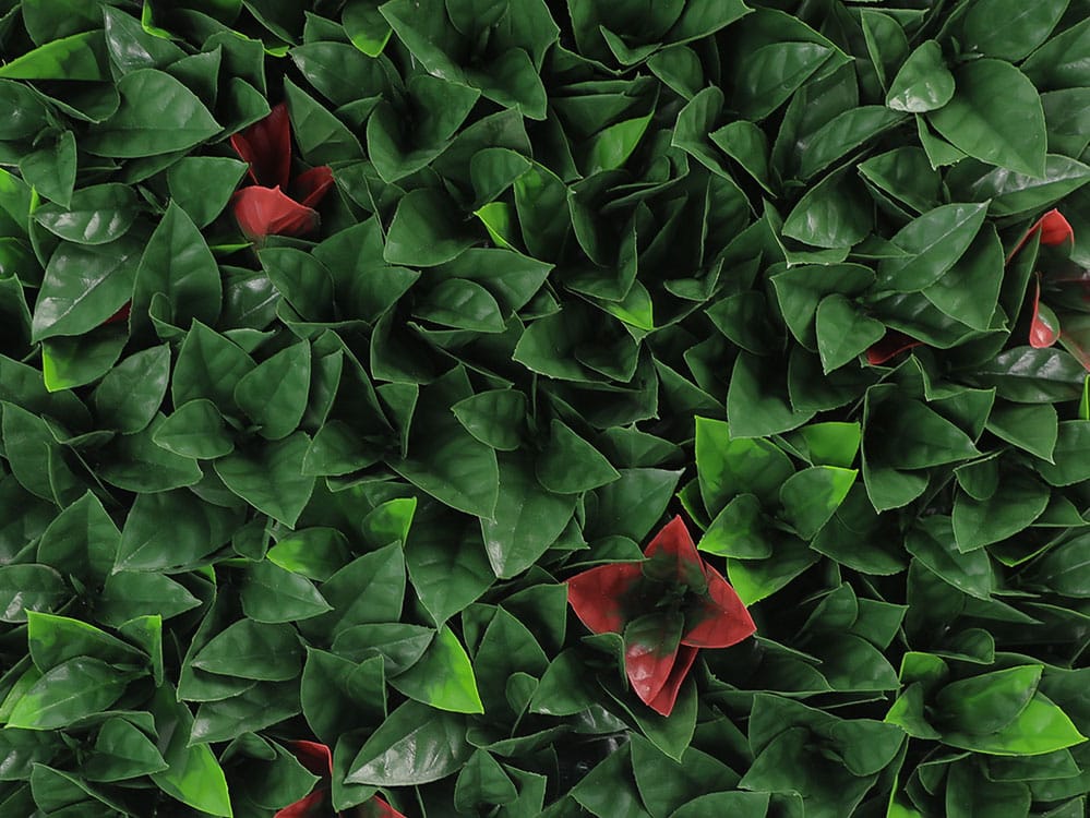 Het red robin paneel is een paneel van 50×50 cm waarmee je eenvoudig een groene wand of decoratieve afscheiding creëert. De panelen zijn geschikt voor zowel binnen als buiten en kunnen eenvoudig worden gekoppeld tot grotere oppervlakken. Dit model onderscheidt zich door de donkergroene puntige bladeren met natuurlijke rode accenten die zorgen voor een levendige en opvallend natuurgetrouwe uitstraling.