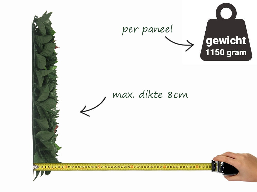 UV-bestendigheid – De panelen zijn voorzien van een UV-bescherming, waardoor verkleuring door zonlicht aanzienlijk verminderd. Hierdoor blijven de bladeren langer mooi van kleur en behoudt het paneel zijn natuurlijke uitstraling, ook wanneer je het buiten gebruikt.