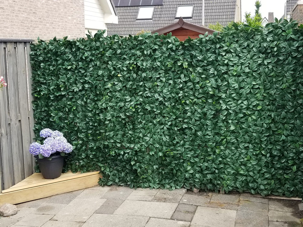 Kunstmatige Laurier hagen laten schuttingen en muren, voorheen kaal, nu groen schitteren. De bladeren vangen het licht, creëren schilderachtige schaduwen en geven de haag karakter. De mat, met zijn speciaal ontworpen dichte achterkant, blokkeert ook doorkijk. Met de volle dichtheid van bladeren zorgt de haag daarom voor een natuurlijk ogende afscheiding. Laurier matten zijn een onderhoudsvrij alternatief voor echte beplanting, eenvoudig te bevestigen en op maat te knippen met een huishoudschaar, passend in elke ruimte. Het gemak komt ook met de standaardafmeting van 50×50 cm.
