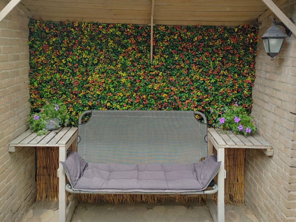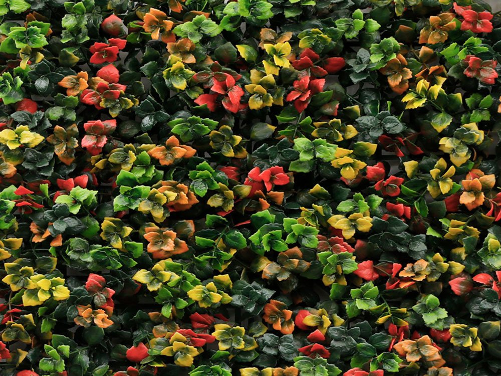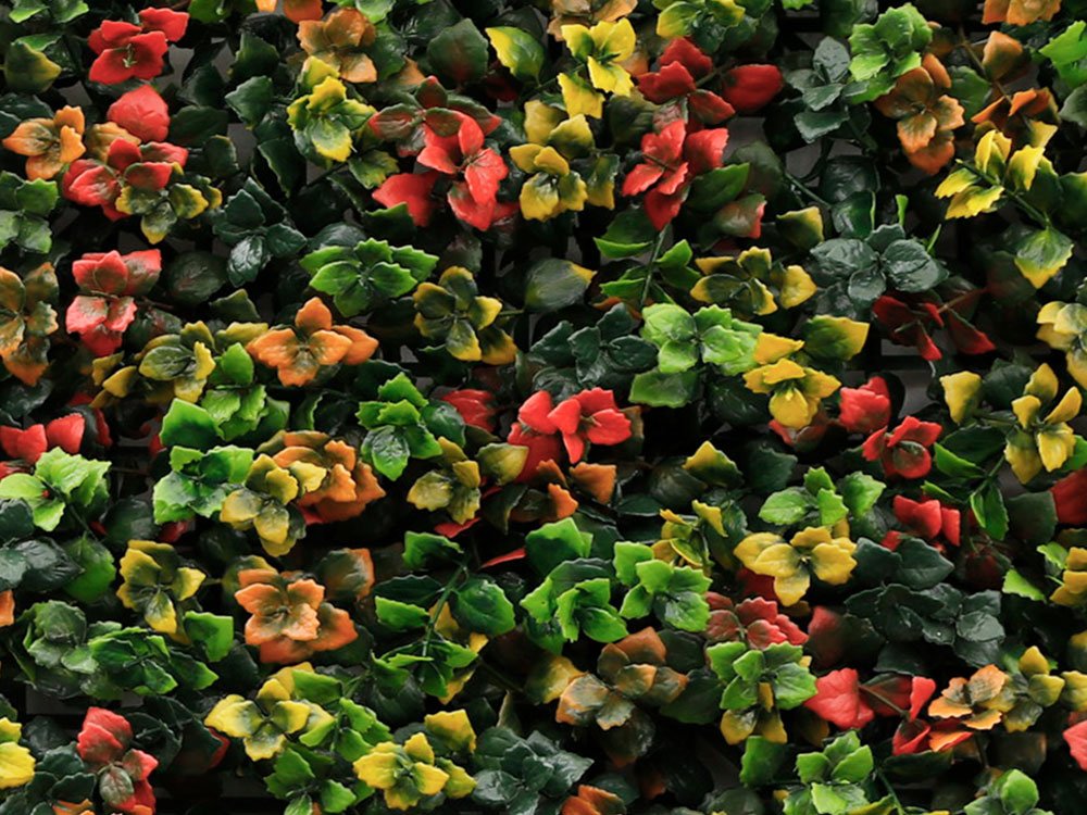 Deze kunsthaag is een symfonie van kleur, met een rijk palet dat de natuurlijke diversiteit viert. Groene bladeren, de ruggengraat van deze creatie, worden verlevendigd door uitspattingen van geel, oranje en dieprood, alsof elk seizoen tegelijkertijd aanwezig is. Enkele bladeren pronken daarnaast met een delicate omranding in een contrasterende kleur, een subtiele knipoog naar de kunstige hand van de natuur. Andere tonen een speels verloop van groen naar geel, waardoor de illusie van een herfstbries die door de haag waait, wordt gewekt. De variatie in bladvormen – van hartvormig tot spits – voegt een gelaagdheid toe die de zintuigen prikkelt. Met deze haag haalt men een blijvende herfstpracht in huis, onderhoudsvrij en steeds veranderend met het licht van de dag.