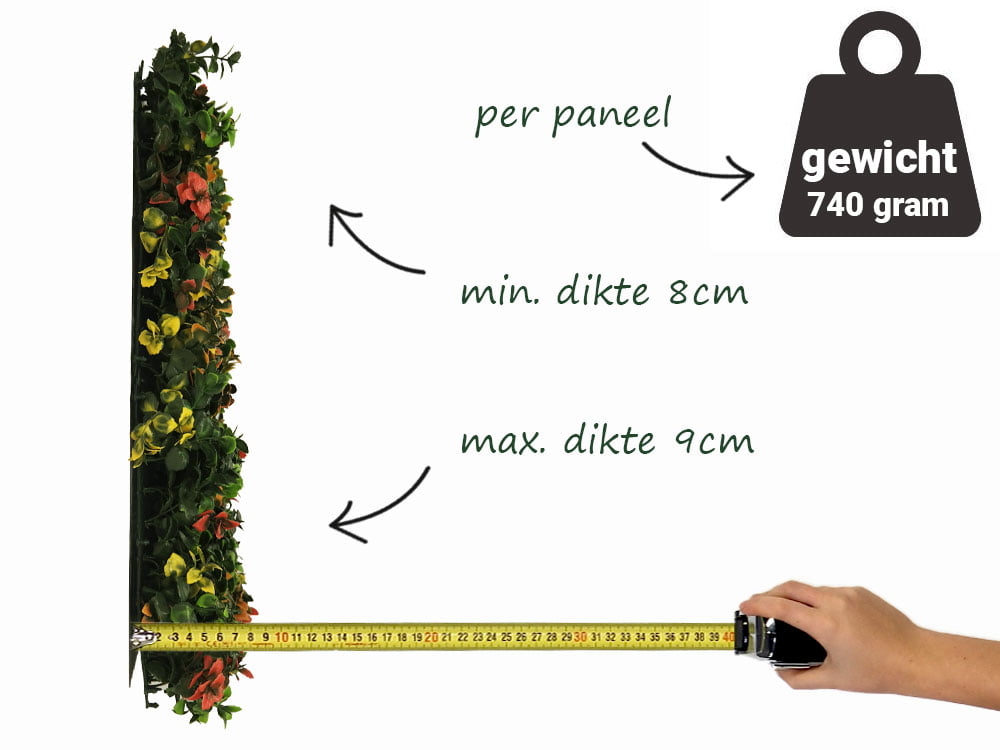 Deze mat beschikt over de geavanceerde Nano-UV-blocker©, perfect voor binnen en buiten. Eenmaal buiten geïnstalleerd is deze haag bestand tegen zonverkleuring. Zelfs bij kunstlicht behoudt de haag zijn frisse charme. Met deze technologie blijven de kleuren van de kunsthaag daarom voor minstens acht jaar na aanschaf levendig.