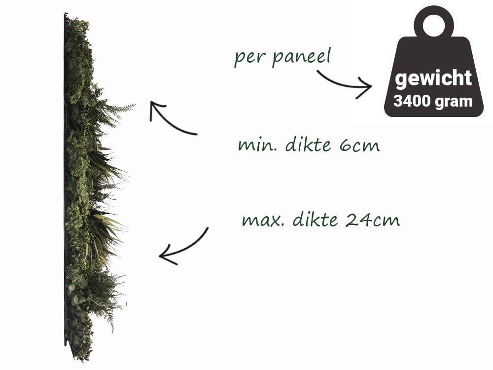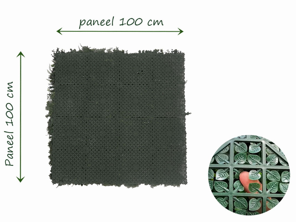 Deze plantenwand combineert verschillende soorten bladeren voor een levendige en natuurlijke uitstraling. Elegante varens geven diepte en textuur, terwijl de fijner gesneden muurvarenbladeren zorgen voor een dichte dekking. De grotere, hartvormige Philodendron-bladeren contrasteren mooi en geven een subtiele glans. Smalle, puntige grasachtige bladeren verspreid over de haag voegen een speels en luchtig element toe. Compacte Buxus-bladeren geven structuur en een volle uitstraling, terwijl verschillende klimopsoorten een gevarieerde en realistische look toevoegen. Deze plantenwand, gemaakt van hoogwaardige materialen, is duurzaam en behoudt zijn schoonheid, zowel binnen als buiten. Geniet van een onderhoudsvrije, groene oplossing voor je ruimte met deze veelzijdige plantenwand.