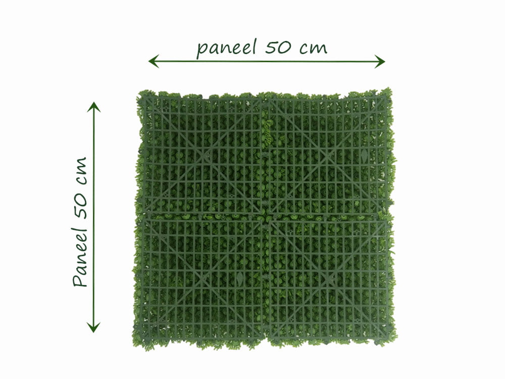 Nep moswand kunstklimop is populair voor het verlevendigen van schuttingen en het creëren van groene muren. De kunststof moswand haag transformeert elk vlak in een natuurlijke groene oase. Grote bladeren veroorzaken een betoverend schaduwspel in het zonlicht, waardoor de moswand een trouwe natuurlijke look krijgt. Ideaal voor het bedekken van doorzichtige hekwerken. Na installatie is er daarnaast geen onderhoud nodig. Montage is simpel: men klikt de matten van 50×50 cm makkelijk aan elkaar en snijdt ze met een huishoudschaar op maat voor elke ruimte.
