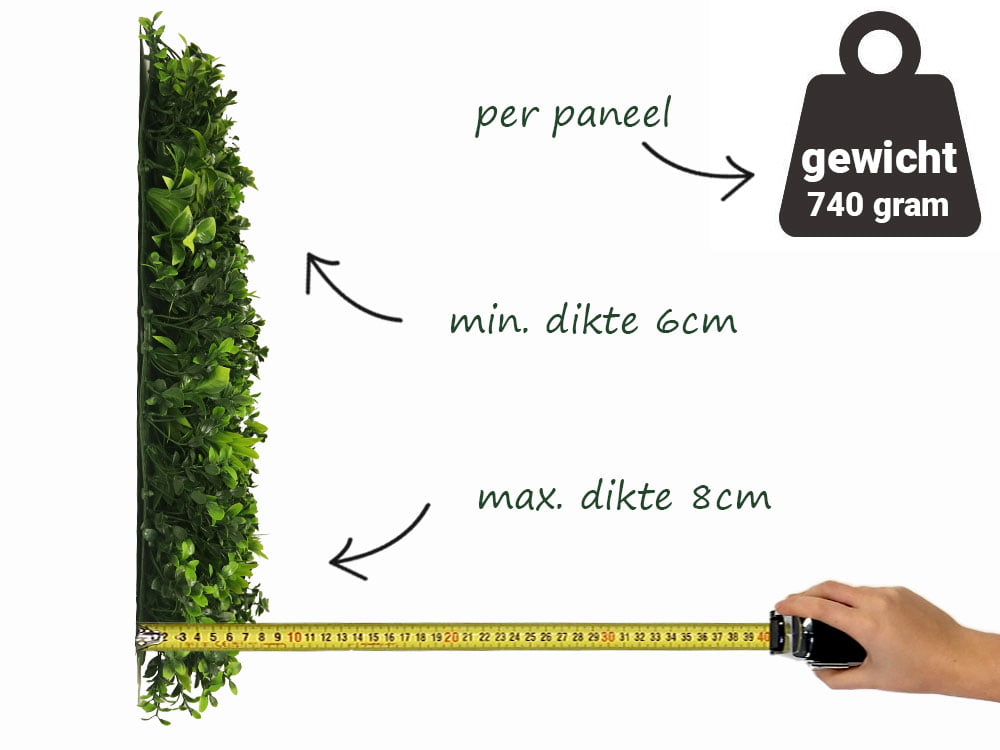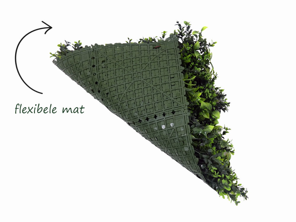 Verschillende elementen bepalen de kwaliteit van een kunsthaag, zoals het materiaal en de technische realisatie. De afwerking van de kunstbladeren en de stevigheid van hun montage spelen een sleutelrol. Even belangrijk is het aantal gemonteerde takjes en bladeren per mat. Bij een high density kunsthaag, dicht bebladerd, is doorkijk minimaal, wat resulteert in een volle, natuurlijke uitstraling. Vergeleken met standaard kunsthagen bevat een high density model aanzienlijk meer bladeren, ongeveer 25% tot 35% extra. Dus voor een groene wand zonder doorzicht op hekwerken of tegen muren, of voor een rijk gevarieerde plantenwand, is een hoge dichtheid aan te bevelen.