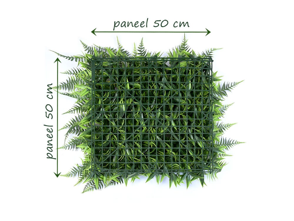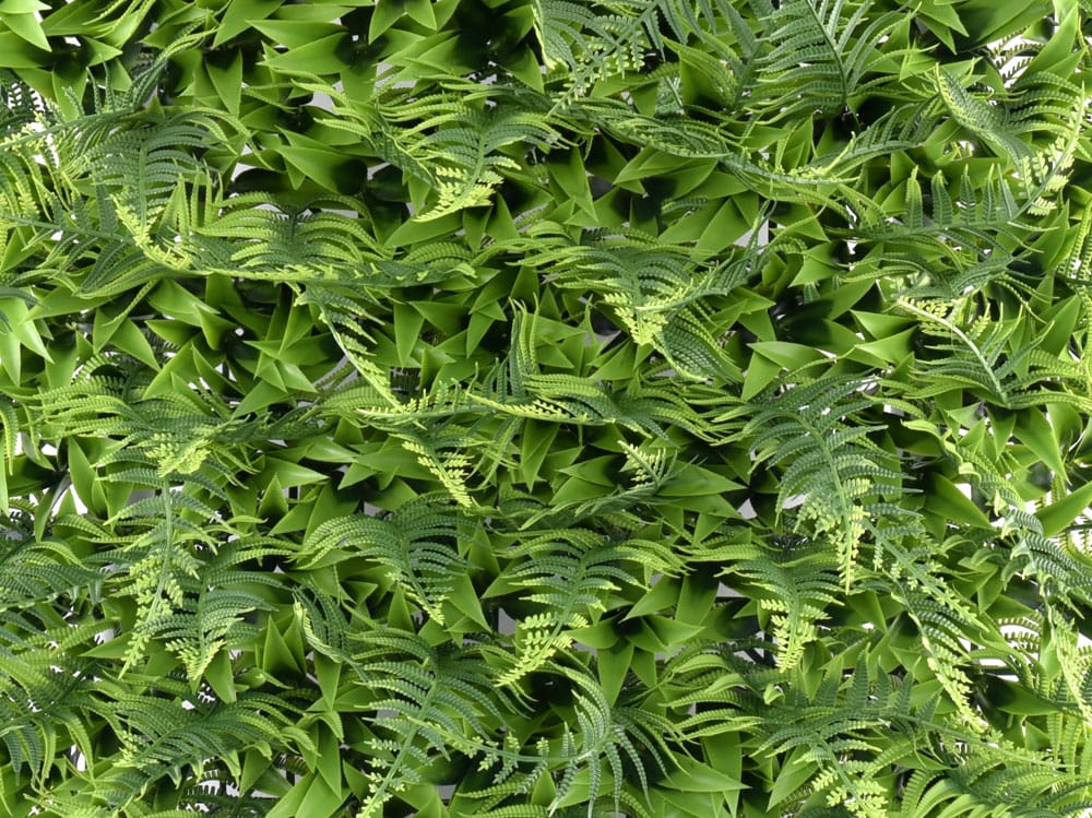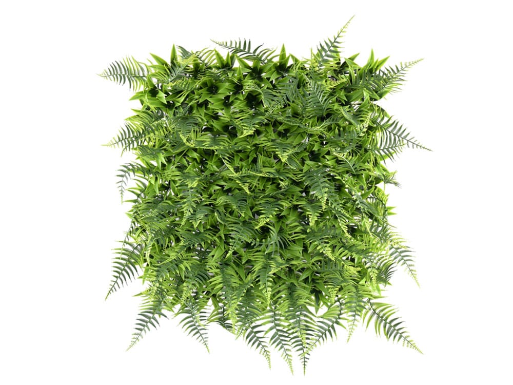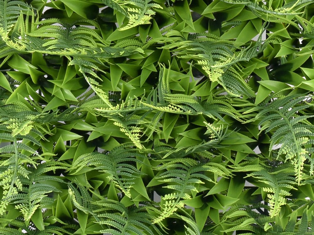 De beplanting van de Varen Bush kunsthaag bestaat uit een speelse mix van slanke, puntige bladeren en elegante varens. De varens hebben fijne, gedetailleerde bladvormen die zorgen voor textuur en diepte. De puntige bladeren vormen de basis en creëren een ritmisch patroon dat de haag structuur geeft. De combinatie van verschillende groentinten zorgt voor een levendig geheel dat goed past bij moderne én natuurlijke interieurs en buitenruimtes.