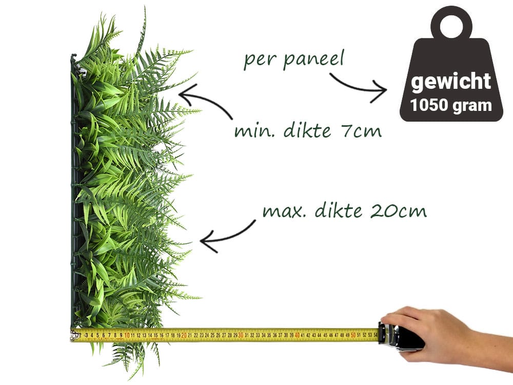 Gebruik de Varen Bush als stijlvol groen accent in horeca, kantoren, showrooms, balkons of tuinen. De varens zorgen voor een levendig reliëf en een rustige, natuurlijke sfeer. Daarom past dit model uitstekend op plekken waar je vooral een decoratieve groene achtergrond wilt. Heb je privacy of volledige afdekking nodig? Kies dan een high-density model of monteer deze haag op een donkere ondergrond voor een voller optisch resultaat. Door de open achterkant is dit paneel lichtdoorlatend. Op lichte ondergronden of hekwerken blijft de achtergrond lichtelijk = zichtbaar, waardoor de haag minder dekkend oogt. Op een donkere ondergrond komt de structuur het mooist tot zijn recht.