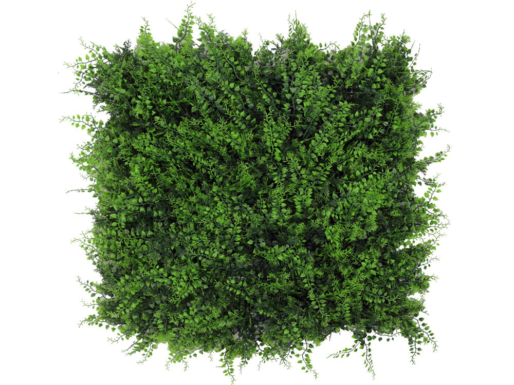 Nep Vegetatie fijn blad dient vaak als versiering voor schuttingen en groene muren. Kunststof hagen brengen leven in elke ruimte met hun groene bladeren. De grote bladeren vangen het zonlicht en creëren een natuurlijke schaduweffect. Dit geeft de Vegetatie klimopwand een trouwe natuurlijke uitstraling, ideaal voor het afschermen van doorkijk bij hekwerken. Deze kunsthaag past op vele plaatsen, zoals muren, plafonds, schuine daken en rondingen. Na installatie is onderhoud overbodig. Montage gaat vlot; men klikt de matten van 50×50 cm eenvoudig aan elkaar en snijdt ze op maat met een huishoudschaar.