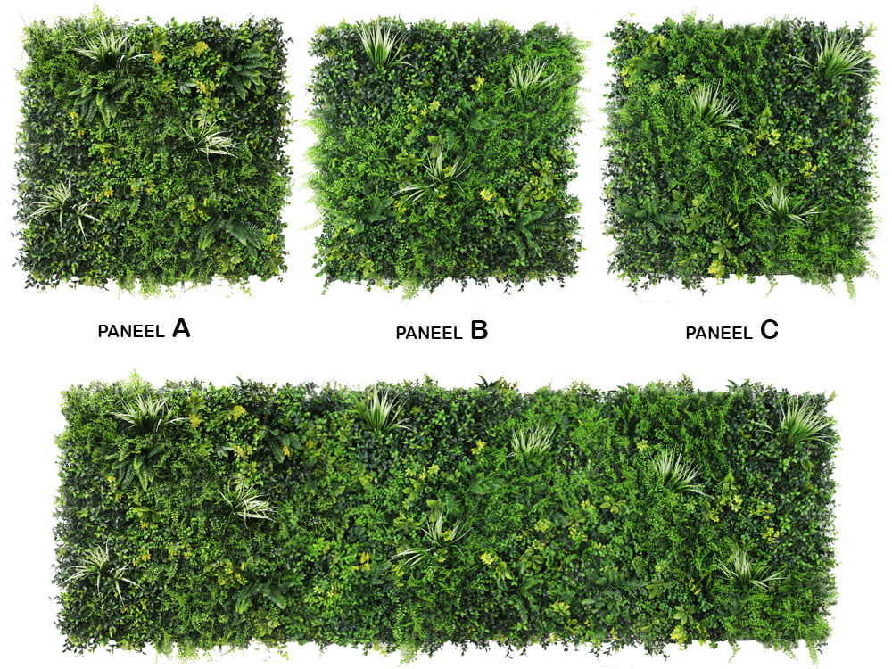 Standaard en goedkopere kunsthagen op de markt komen uit een uniforme productie, met elke mat van 100×100 cm identiek aan de andere. Hierdoor ontstaat een repetitief patroon op de kunstplantenwand om de 100 cm. Voor een natuurlijker en fraaier effect zijn de bloemen en planten telkens iets anders op elke mat gemonteerd. Dit samenspel van matten elimineert zichtbare overgangen of patronen, waardoor de kunsthaag een creatiever en aantrekkelijker aanzicht heeft. Kunsthaagvoordeel past de ‘zonder patroon’-techniek toe. Bij modellen waar herhaling optreedt, zijn meerdere ontwerpen beschikbaar. Een gebalanceerde distributie van deze ontwerpen doorbreekt monotone herhaling. De 100×100 cm panelen zijn verkrijgbaar in vier varianten, gemerkt als A, B, C of D. In bestellingen zijn deze panelen willekeurig verpakt, waardoor een keuze voor een specifiek ontwerp overbodig is.