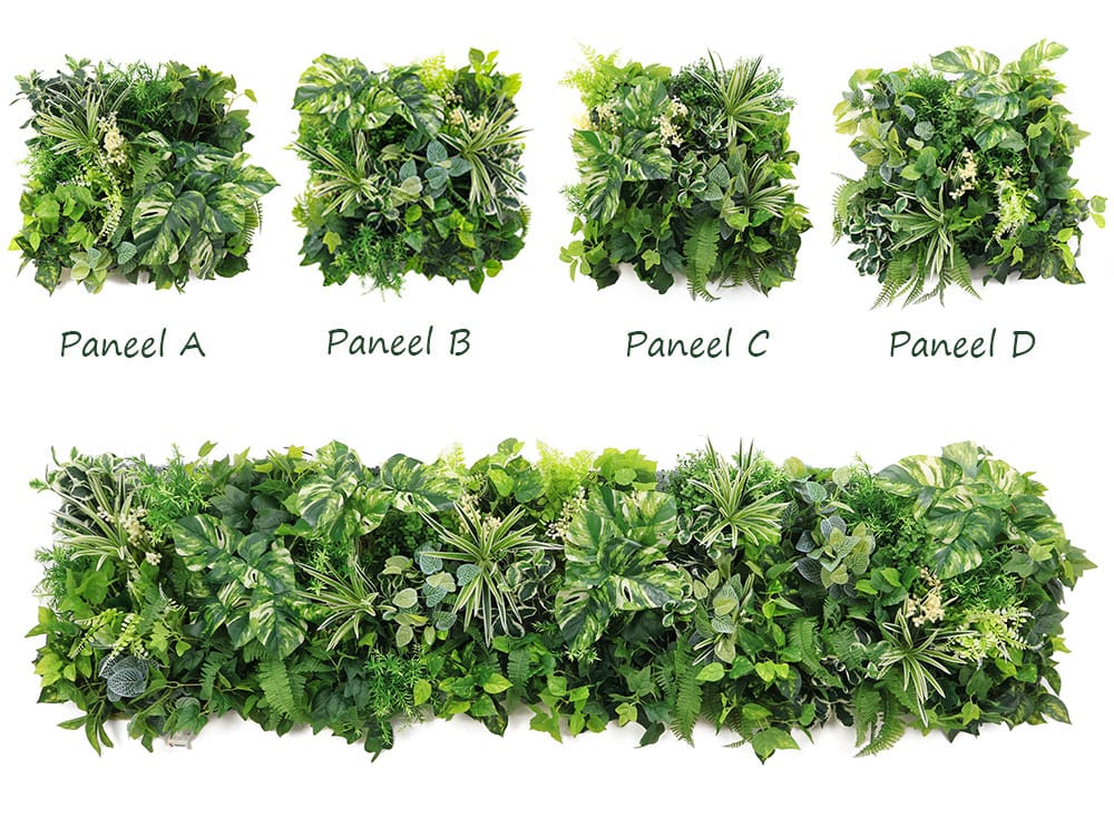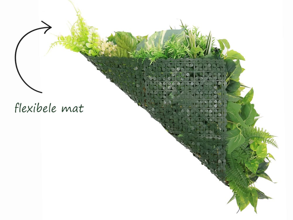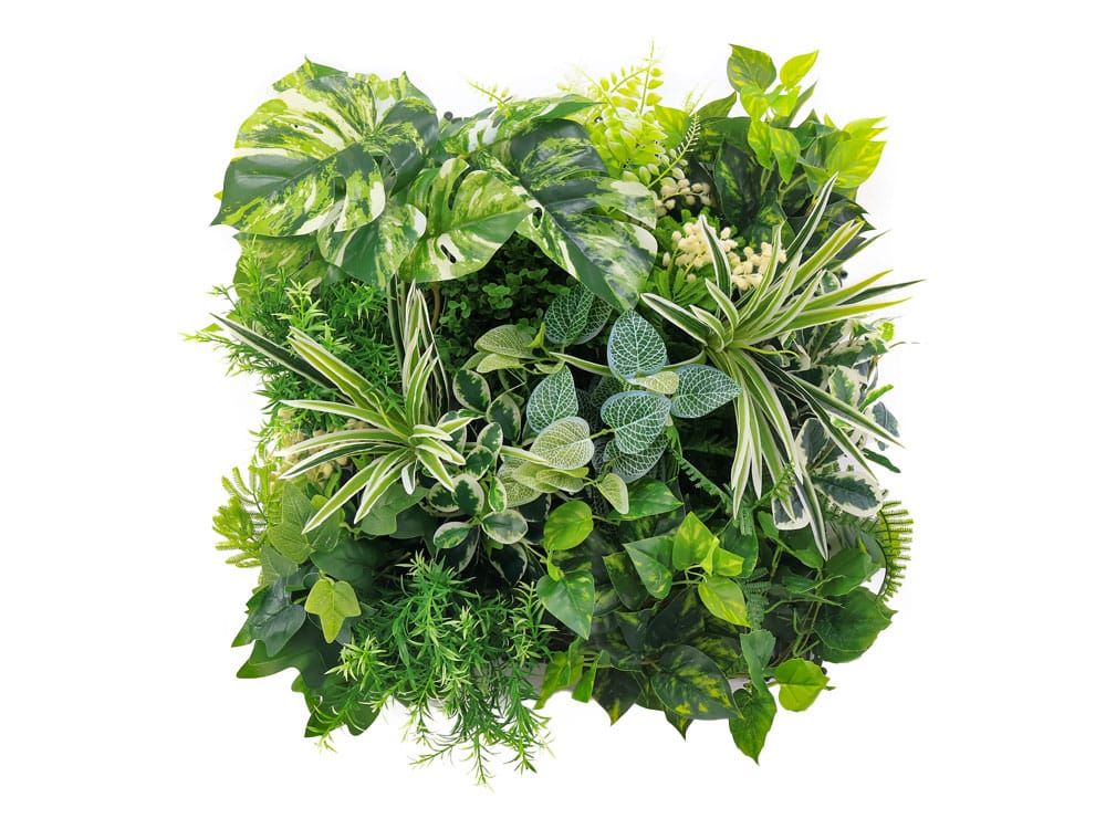 Deze kunsthaag combineert diverse tropische bladsoorten en creëert daarmee een volle, natuurlijke uitstraling. De variatie van fijn- tot grofbladige varens zorgt voor diepte en textuur, terwijl de opvallende witte monstera-bladeren direct de aandacht trekken. Daarnaast voegen mozaïekplanten (fittonia), klimop, chlorophytum (graslelie) en vetplantachtige accenten extra dimensie en realisme toe aan het geheel.