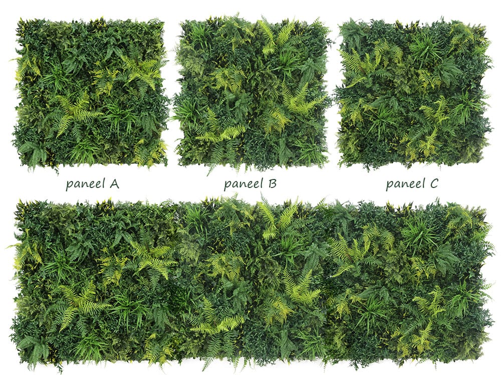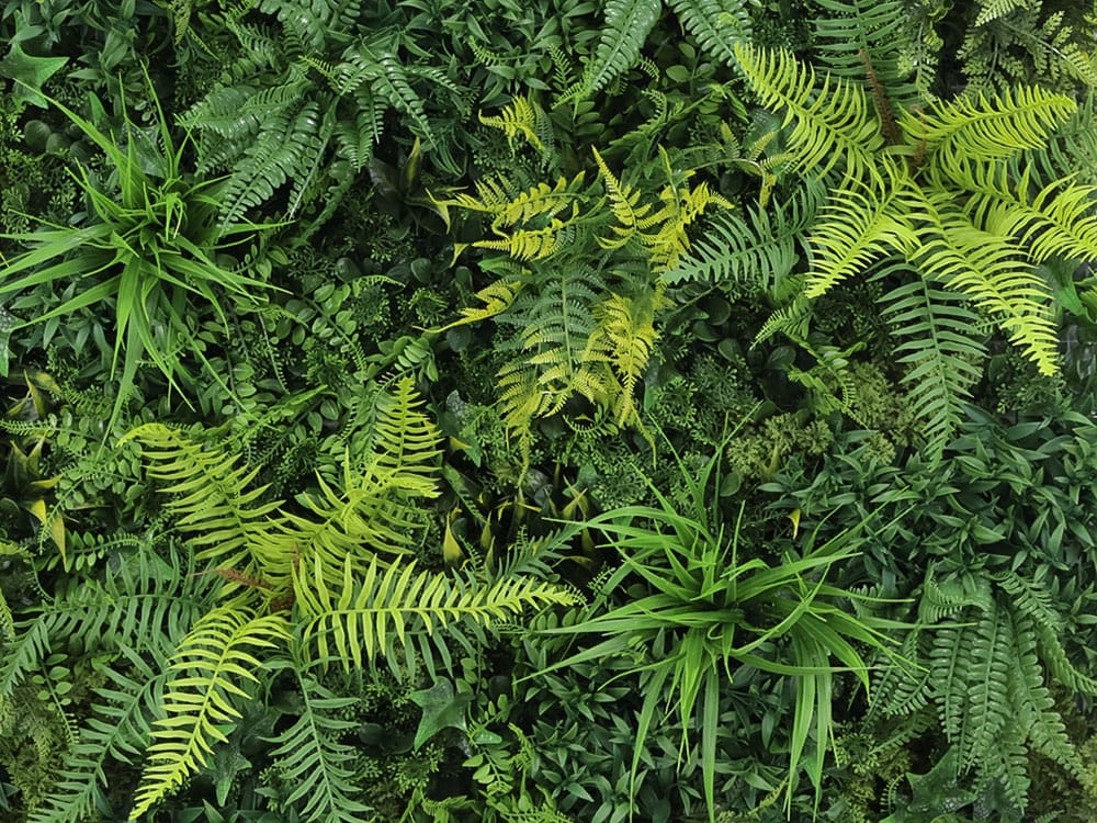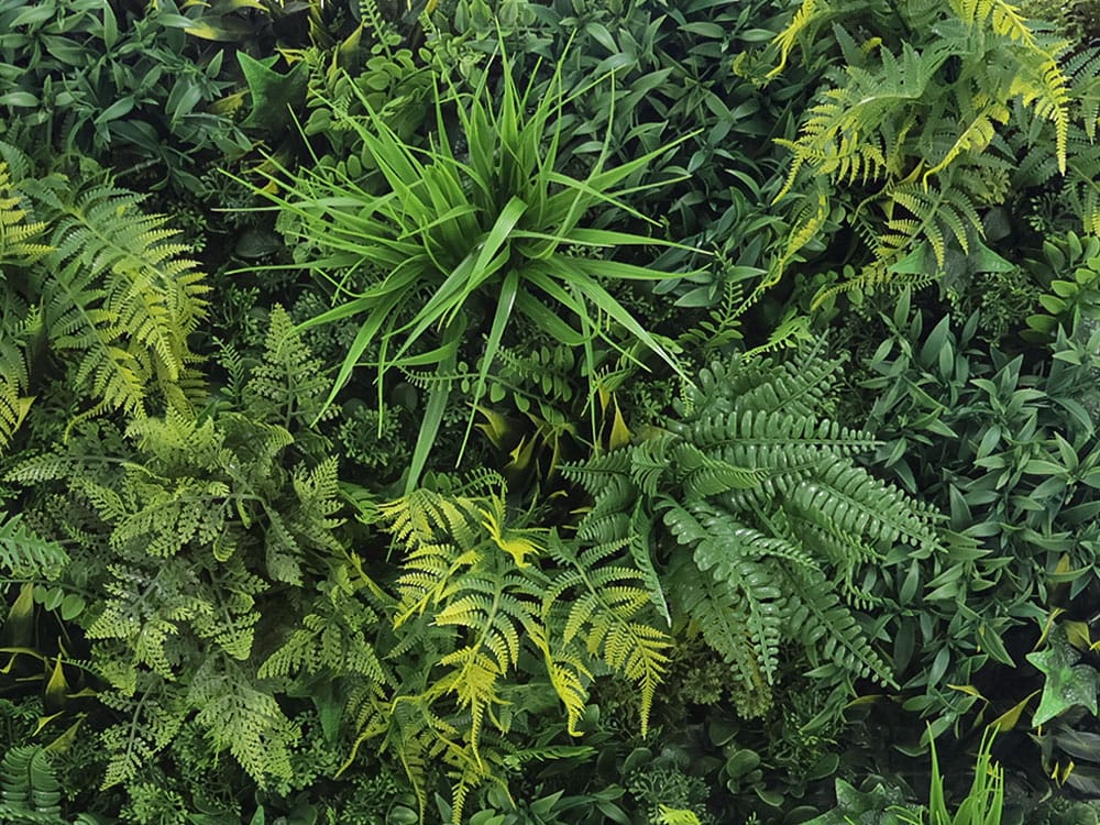 Deze kunsthaag is geïnspireerd door de weelderige uitstraling van een bosrand met diverse varens en grasachtige planten. De combinatie van fijnbladige varens, uitgestrekte grassoorten en ander groen creëert een natuurlijke, rustgevende uitstraling. Het resultaat is een groene muur die niet alleen decoratief is, maar ook bijdraagt aan een rustige, bosachtige sfeer in jouw interieur of tuin.